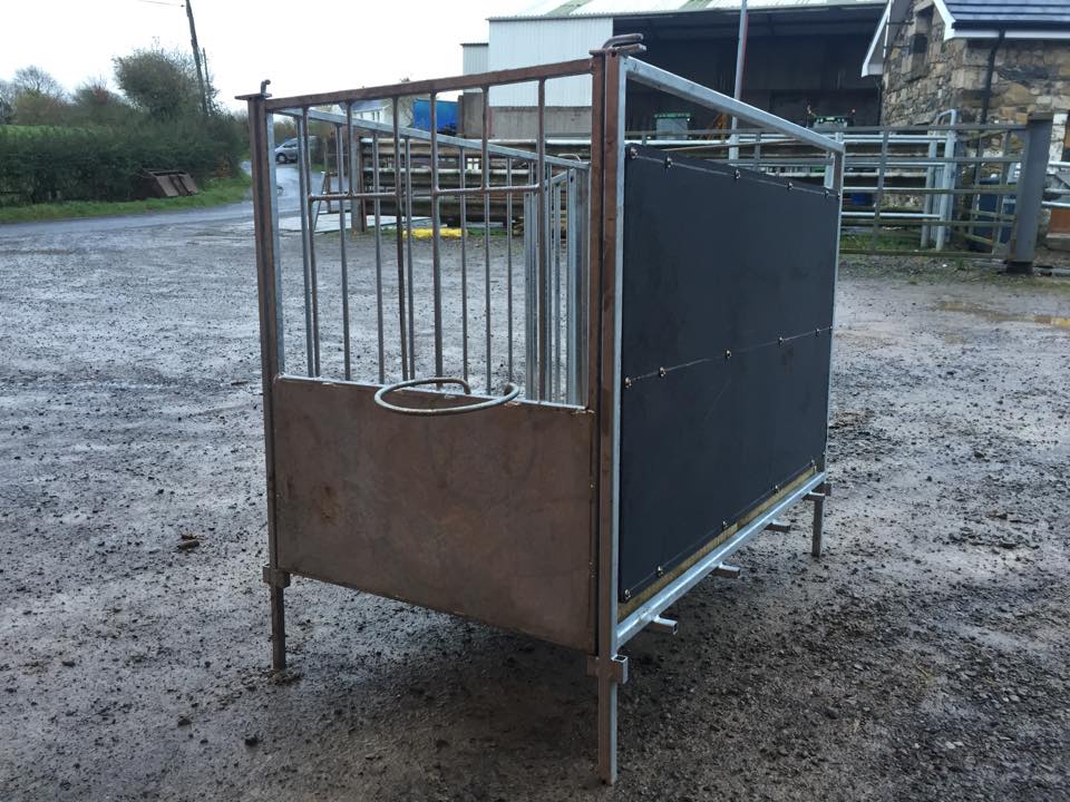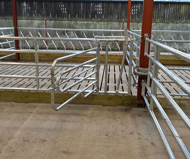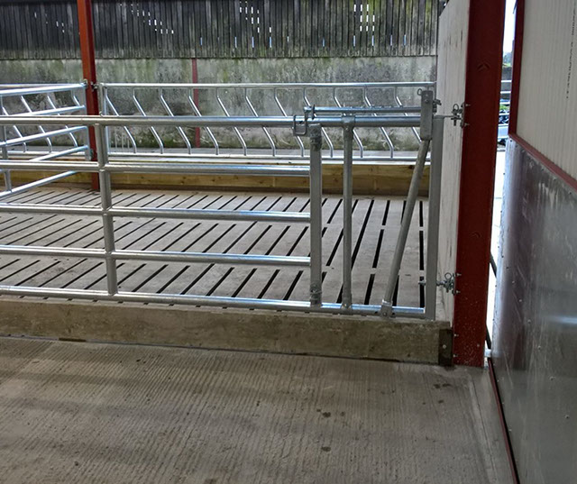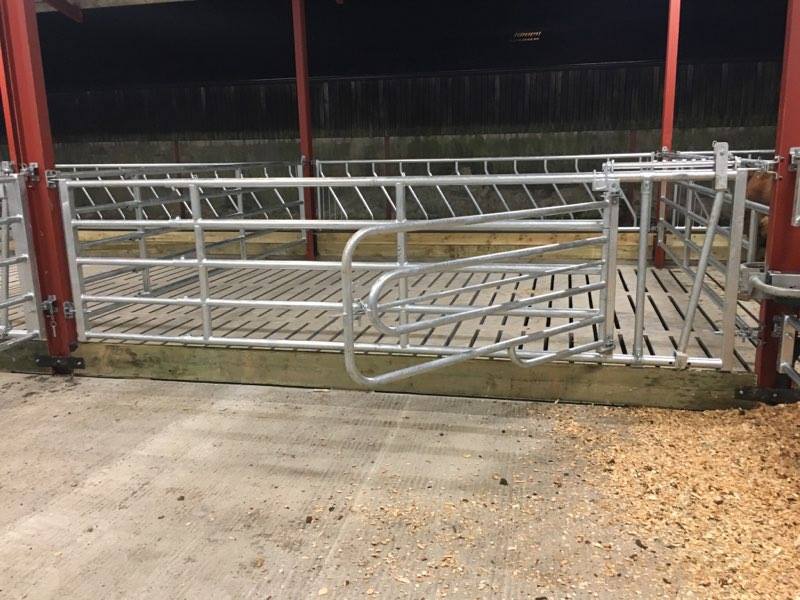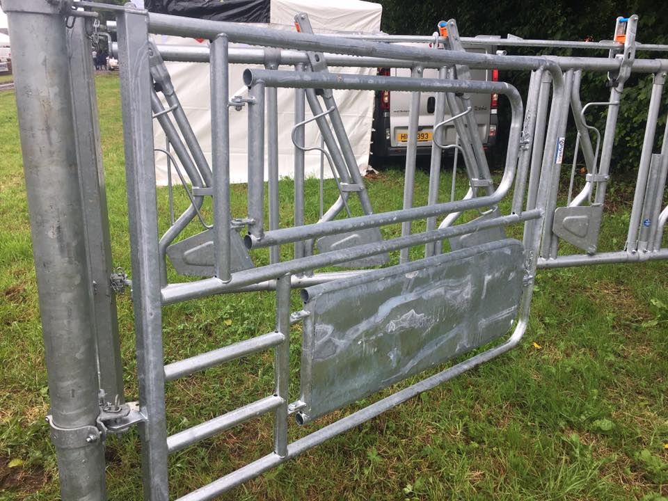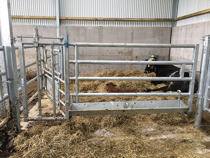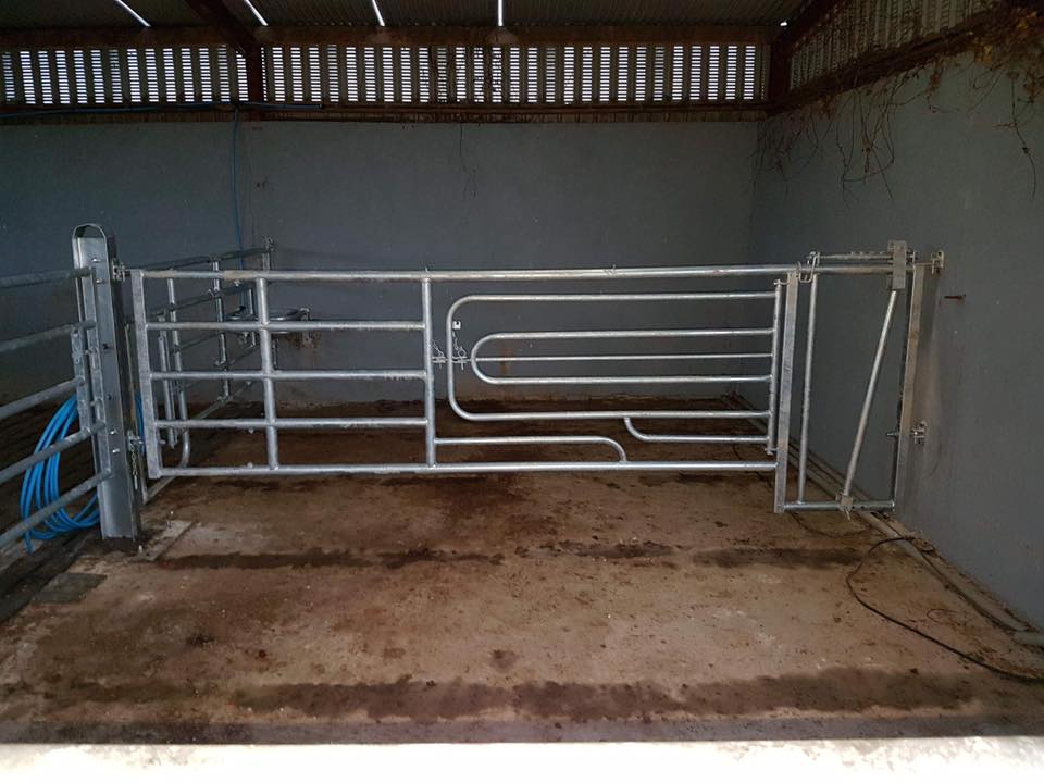 A calving gate system with a headlock attached to a 5-bar dividing gate and a removable operating panel.