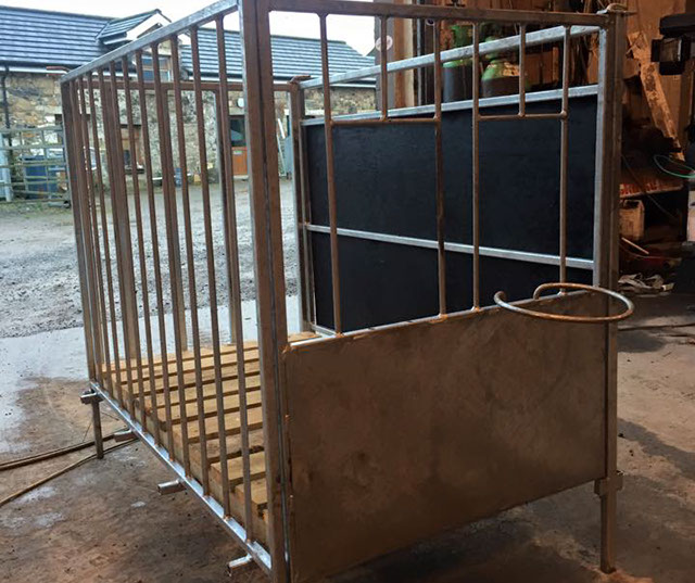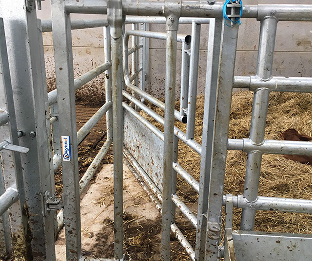 A calving gate system with a headlock attached to a 5-bar dividing gate and a removable operating panel.